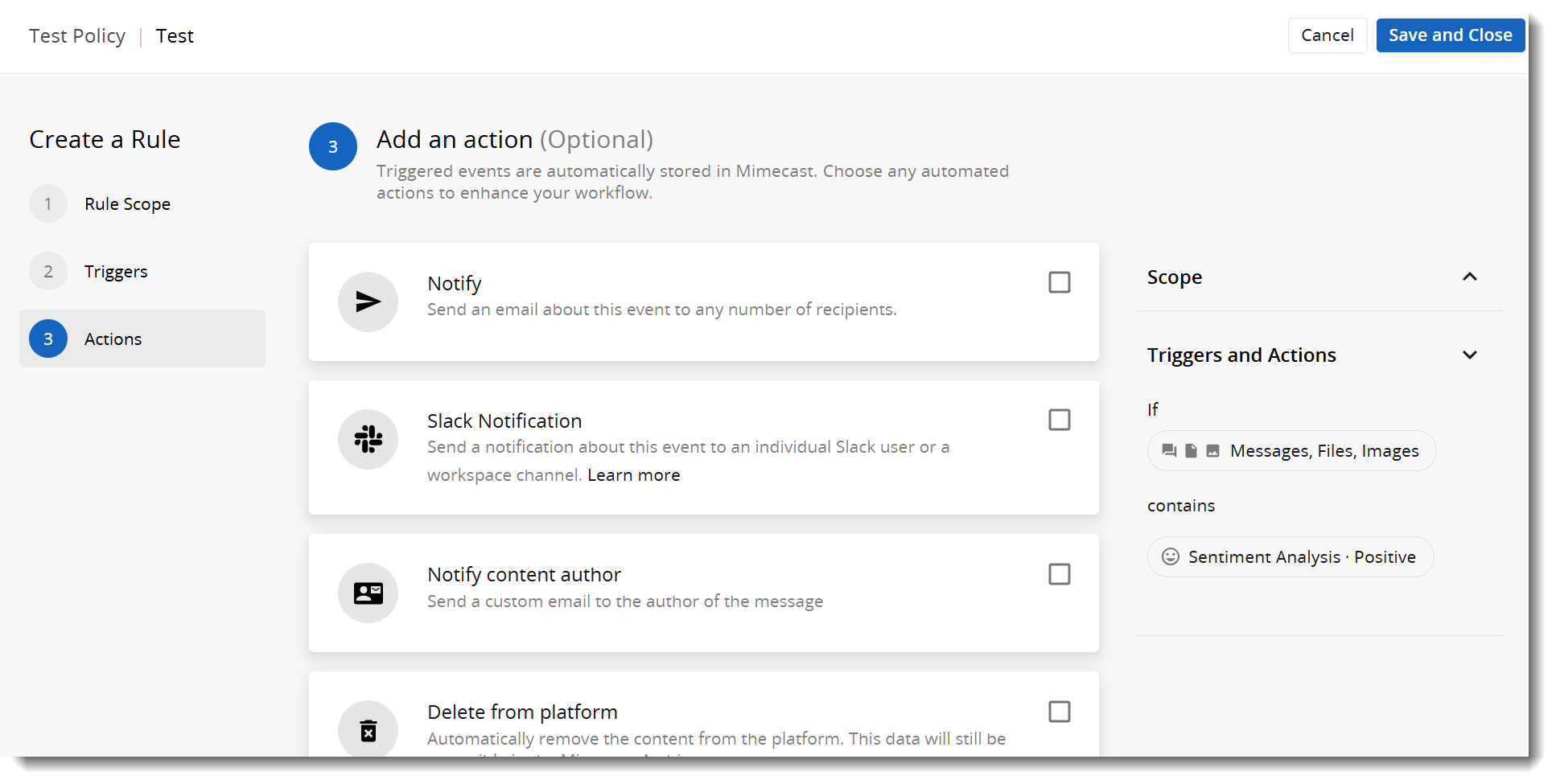 The final step in Rule creation is selecting Actions, which is optional since an Event with details will automatically populate for review within Aware. However, choosing an Action can help guide employees on best practices, remove zero-tolerance content, or send notifications.