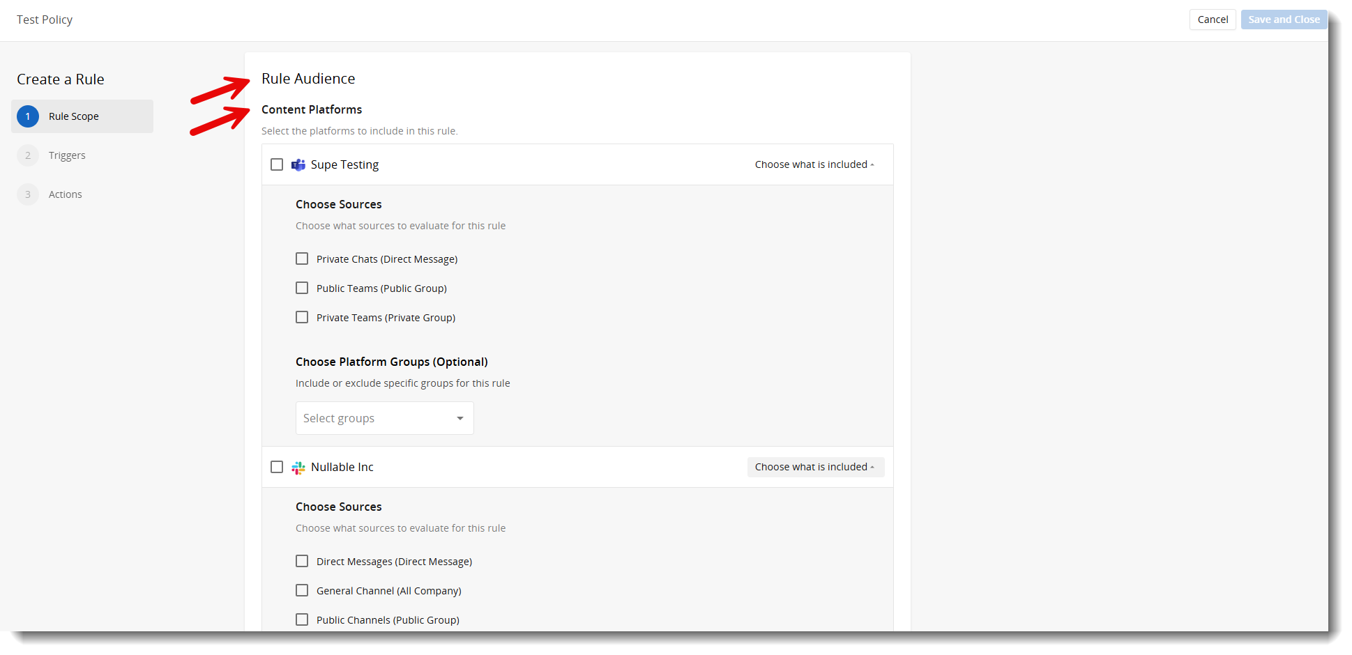 - Next to your integrated Content Platform, you can choose what is included by expanding the section. Here, you can select Sources and Groups to include or exclude. This will help to reduce false positives by narrowing the content scope. This article provides information on creating your first Policy and Rule in Aware Signal, including the differences between Policies and Rules, step-by-step instructions for setup, and guidance on defining Rule behaviors, audience, and triggers.
