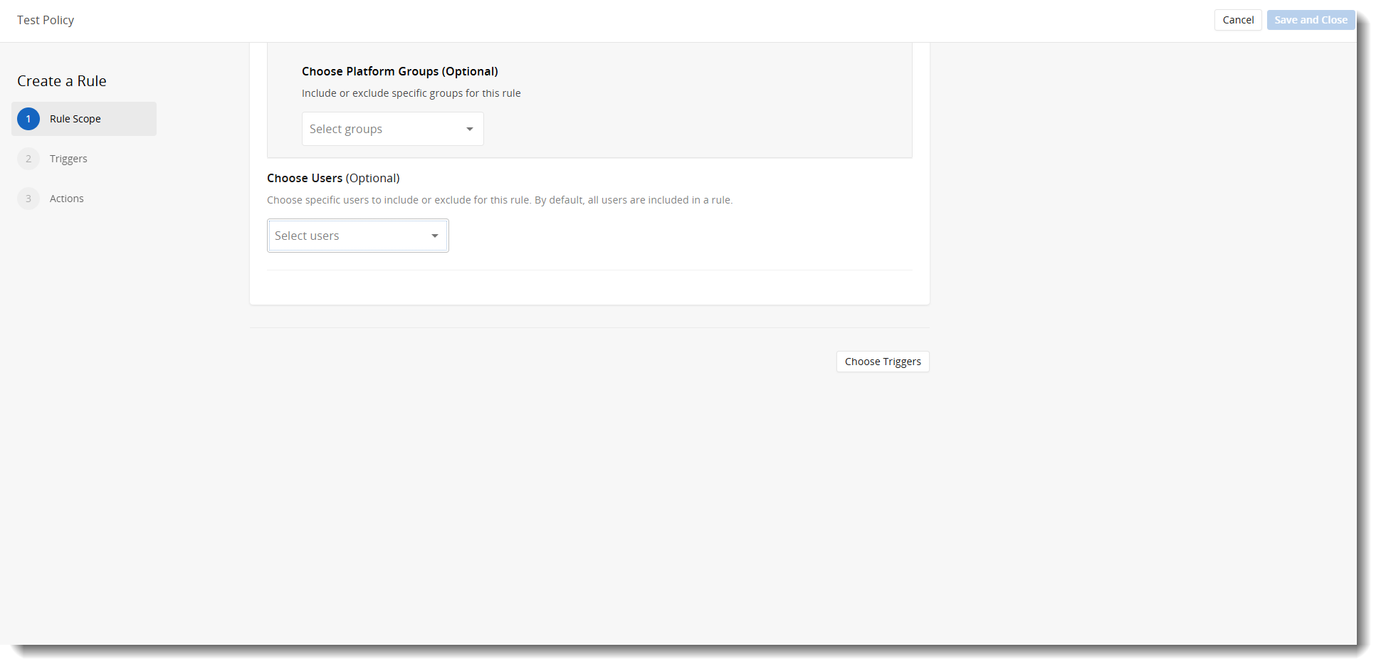 To move on to the next step in Rule creation, select Choose Triggers. Click here to learn more about Rule Triggers.