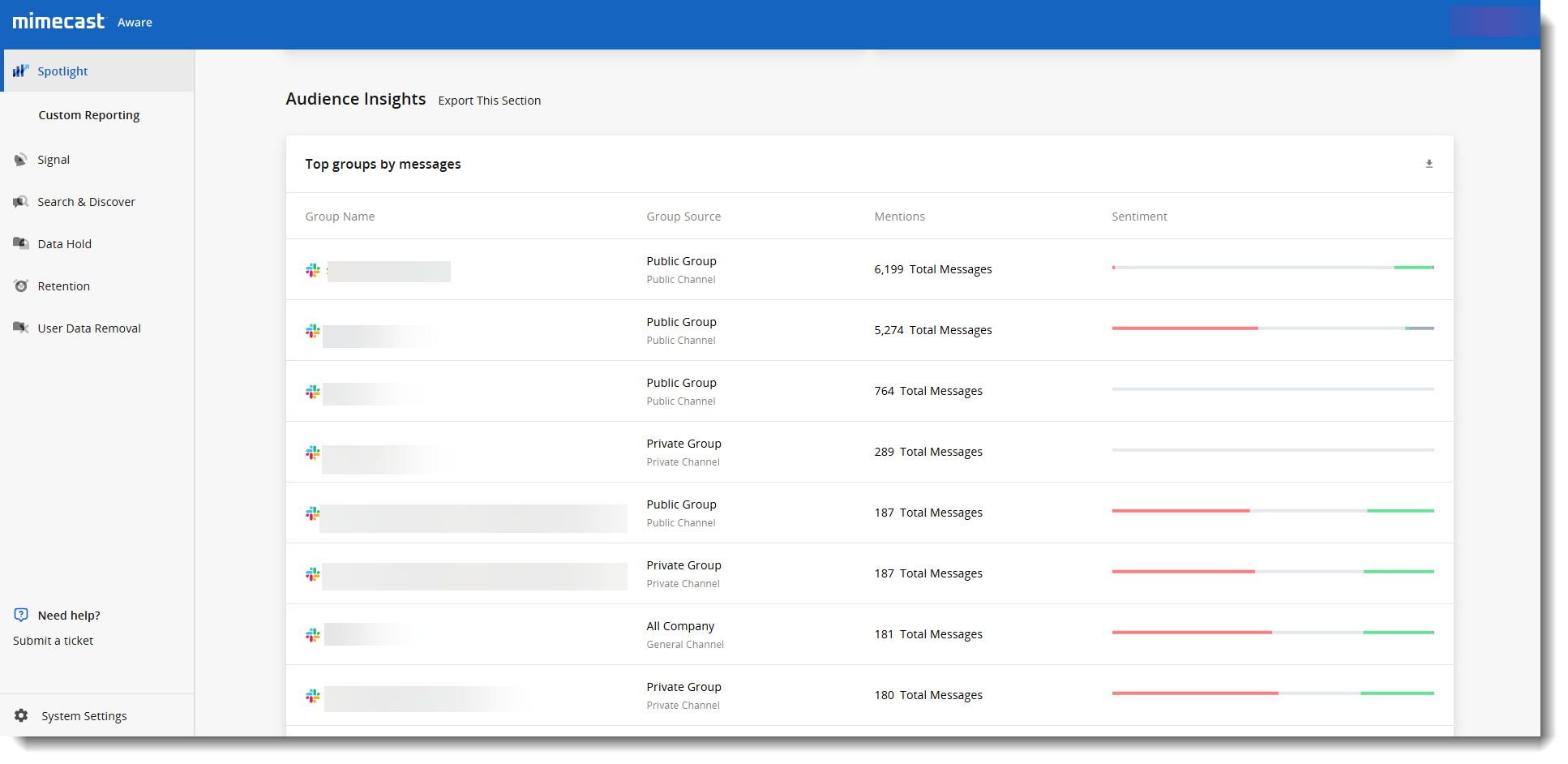 - Top Group by Messages: Top mention count by Group with a Sentiment breakdown. Hover over the Sentiment bar to display the breakdown values. This section is exportable via the download button found in the top right corner of the section.